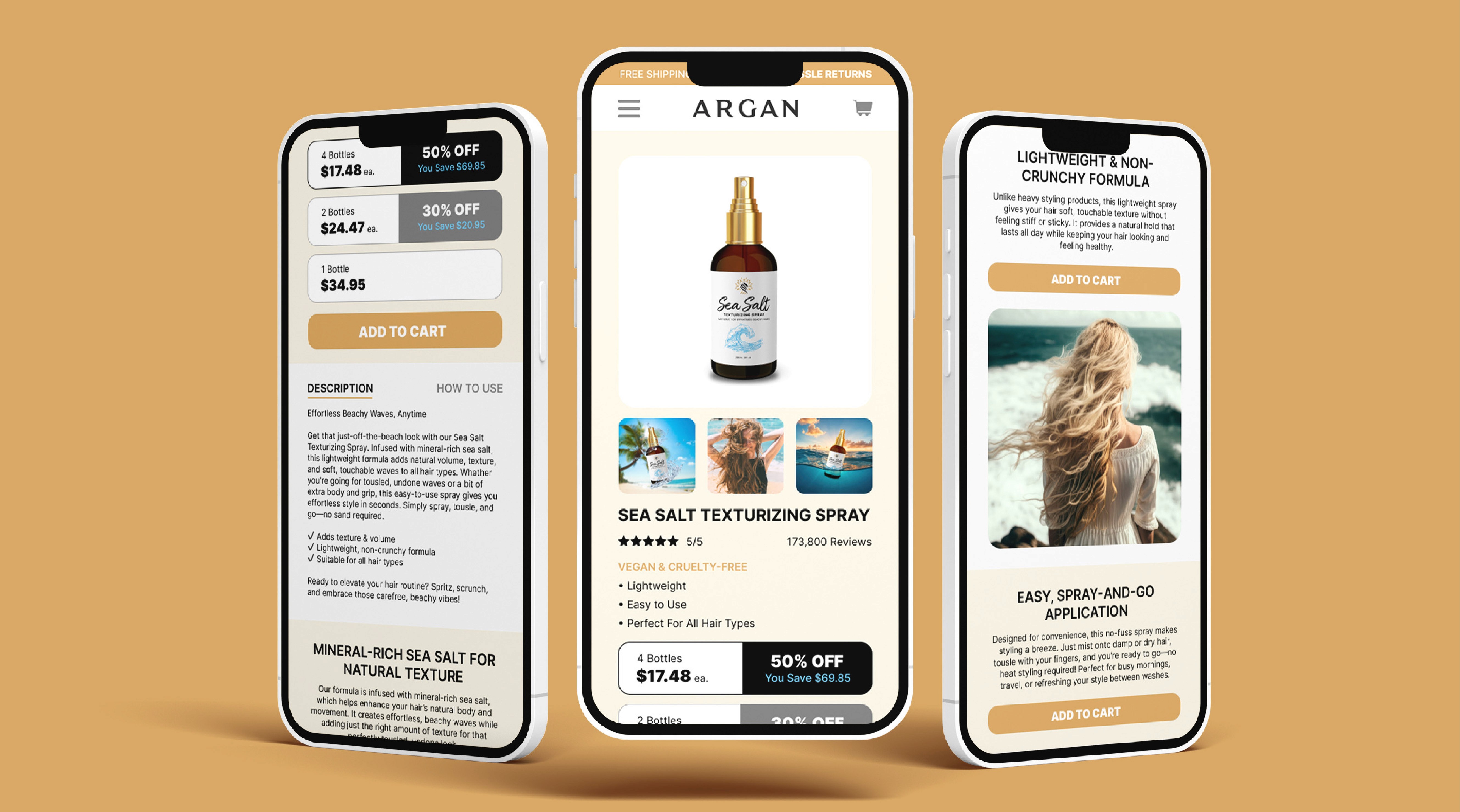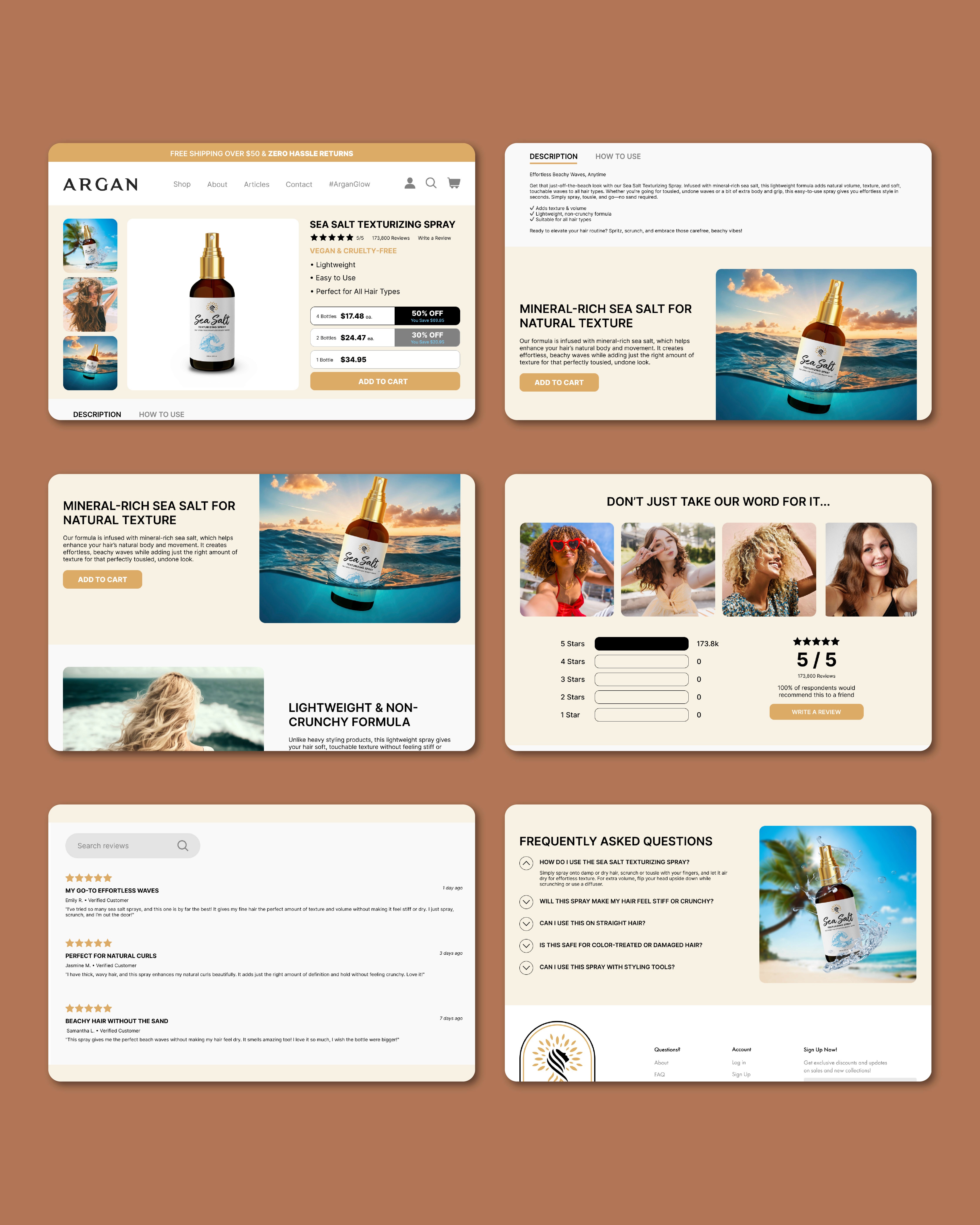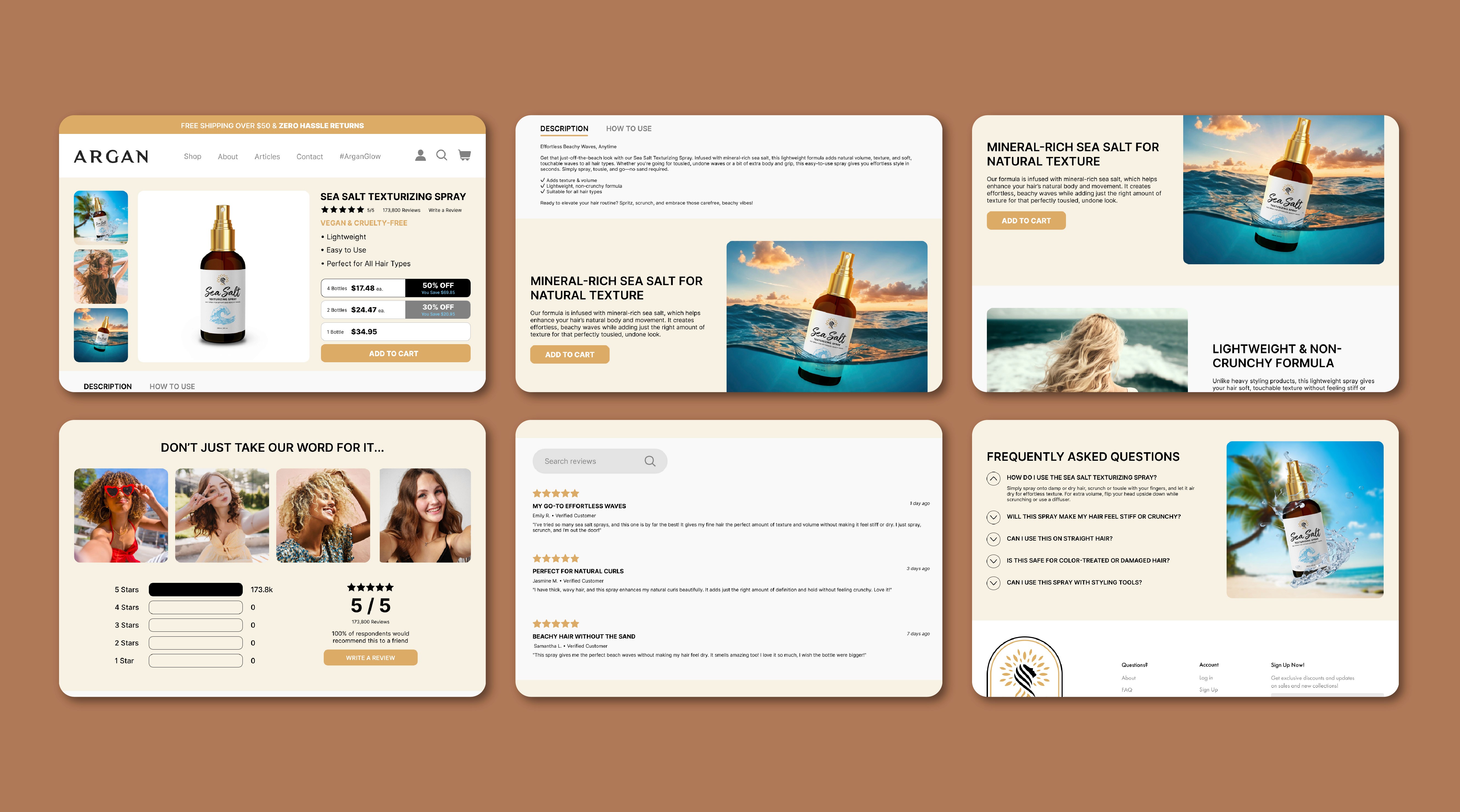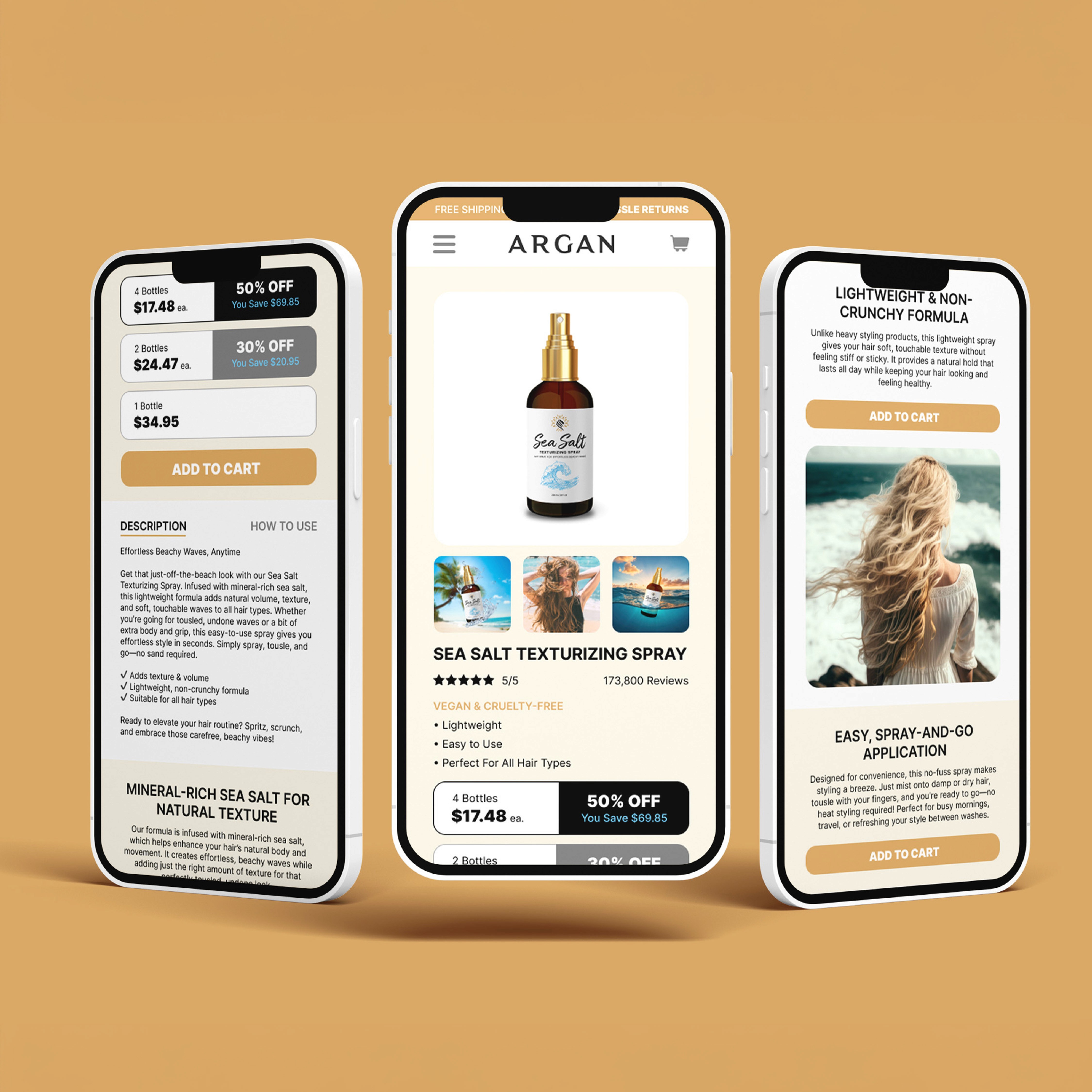The Argan Oil Sea Salt Spray was developed to meet growing consumer demand for natural texture products that enhance waves without dryness or stiffness. The goal was to introduce a styling product that felt nourishing, beach-inspired, and elevated—bridging performance and luxury.