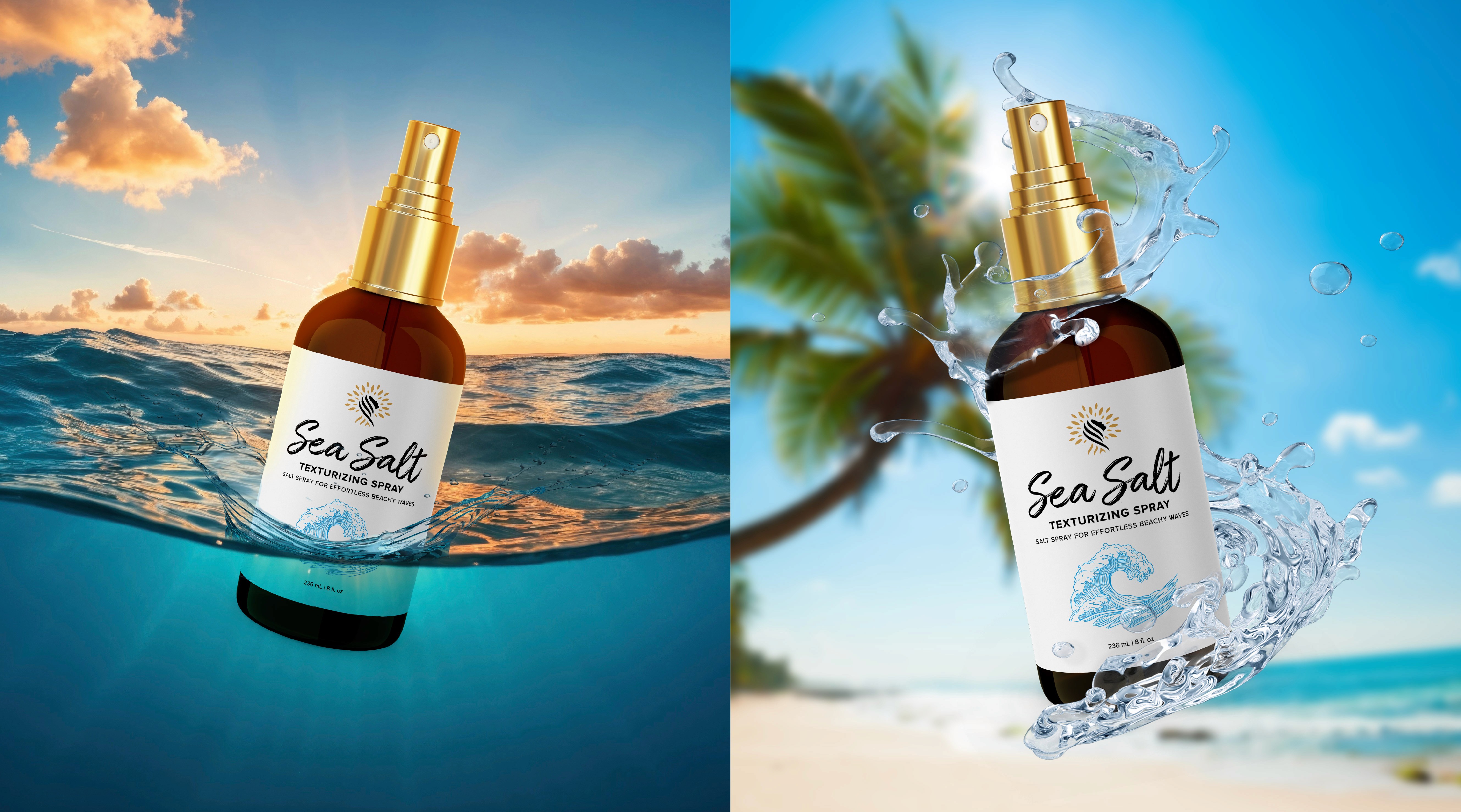 Product imagery was designed to evoke motion and effortlessness. Environmental lighting, water splashes, and coastal backdrops visually reinforce the spray’s promise of natural texture and hydration.