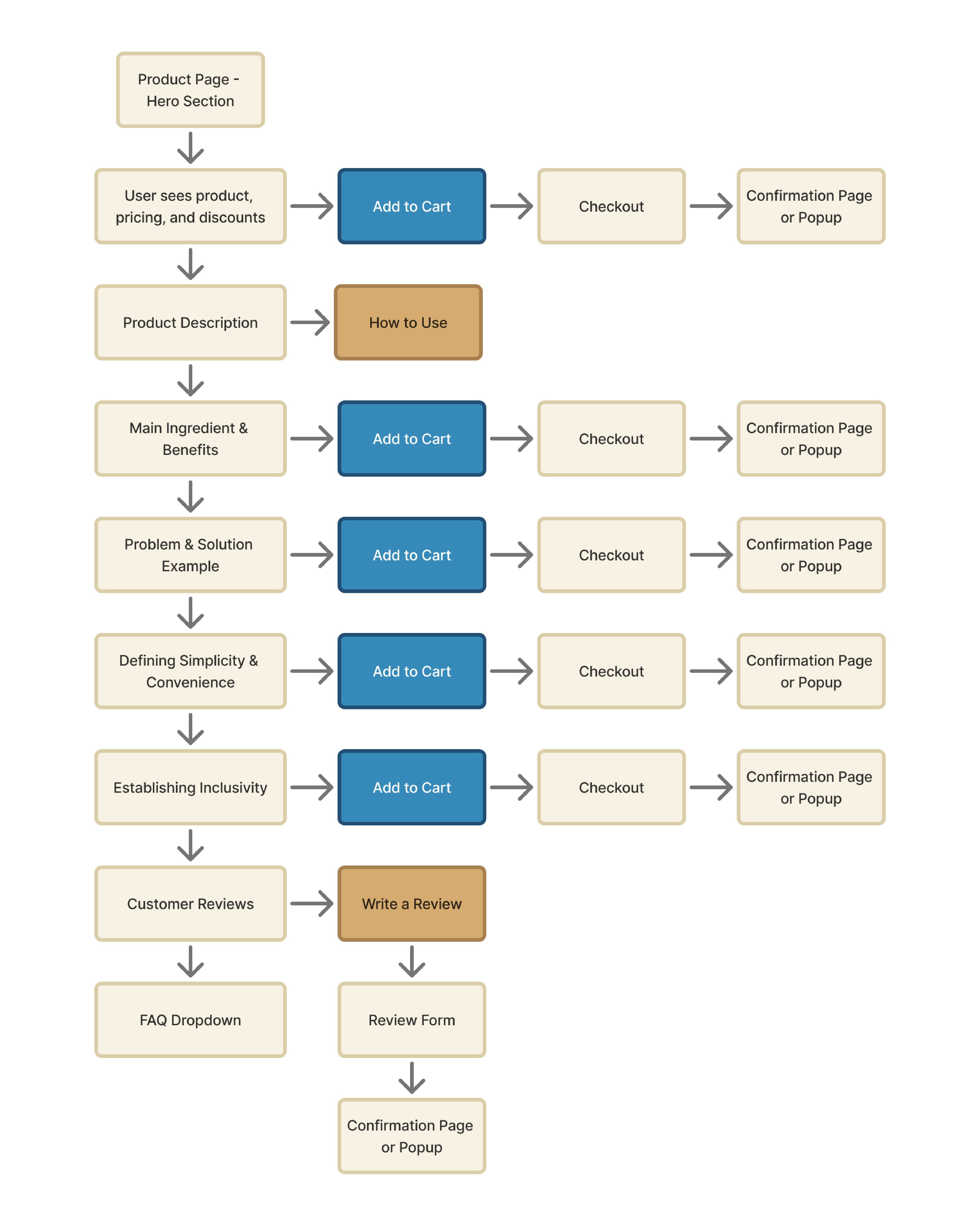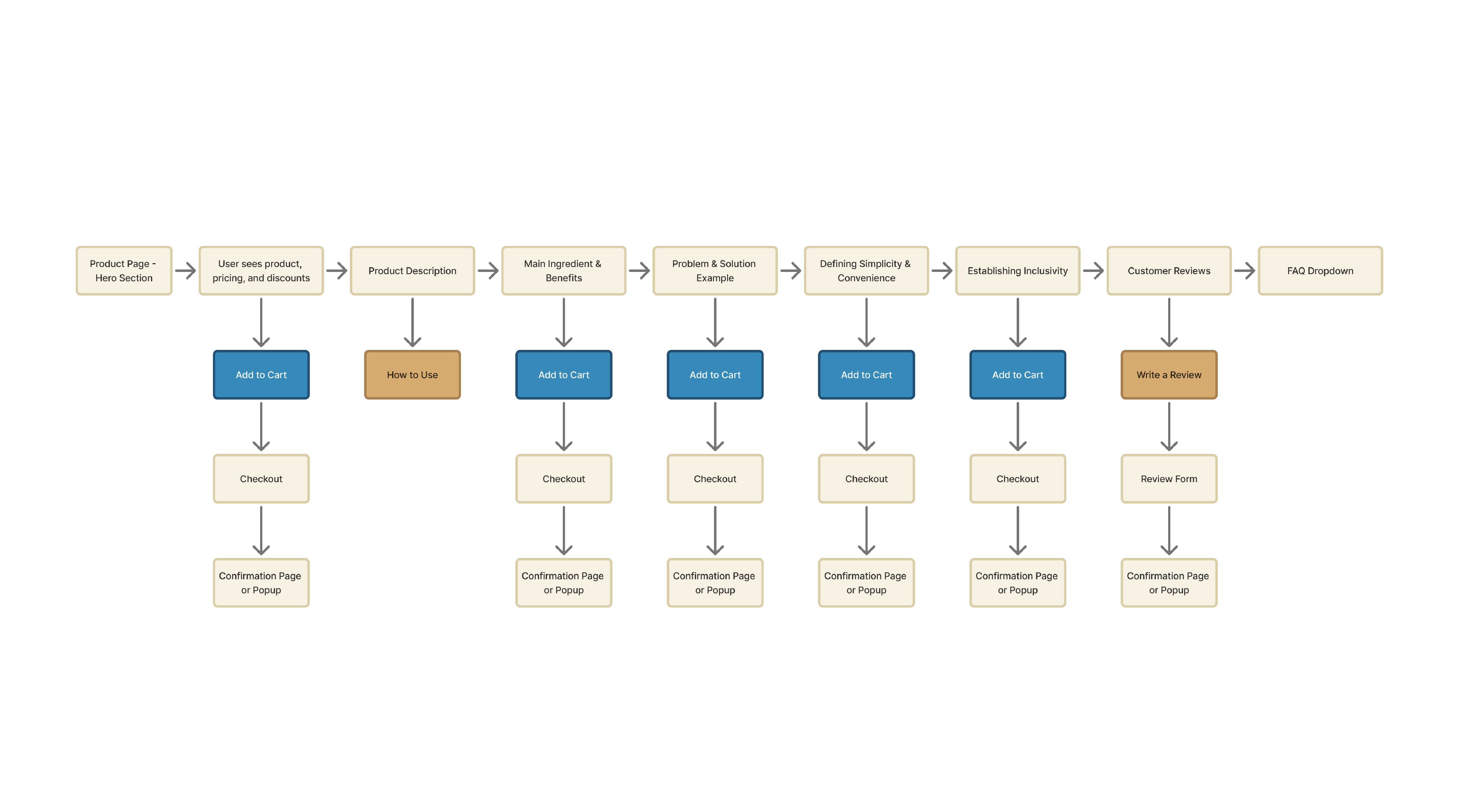 The user flow was designed to guide customers intuitively from product discovery to purchase. Clear value propositions, ingredient highlights, and social proof are layered progressively, reducing decision fatigue and building trust.