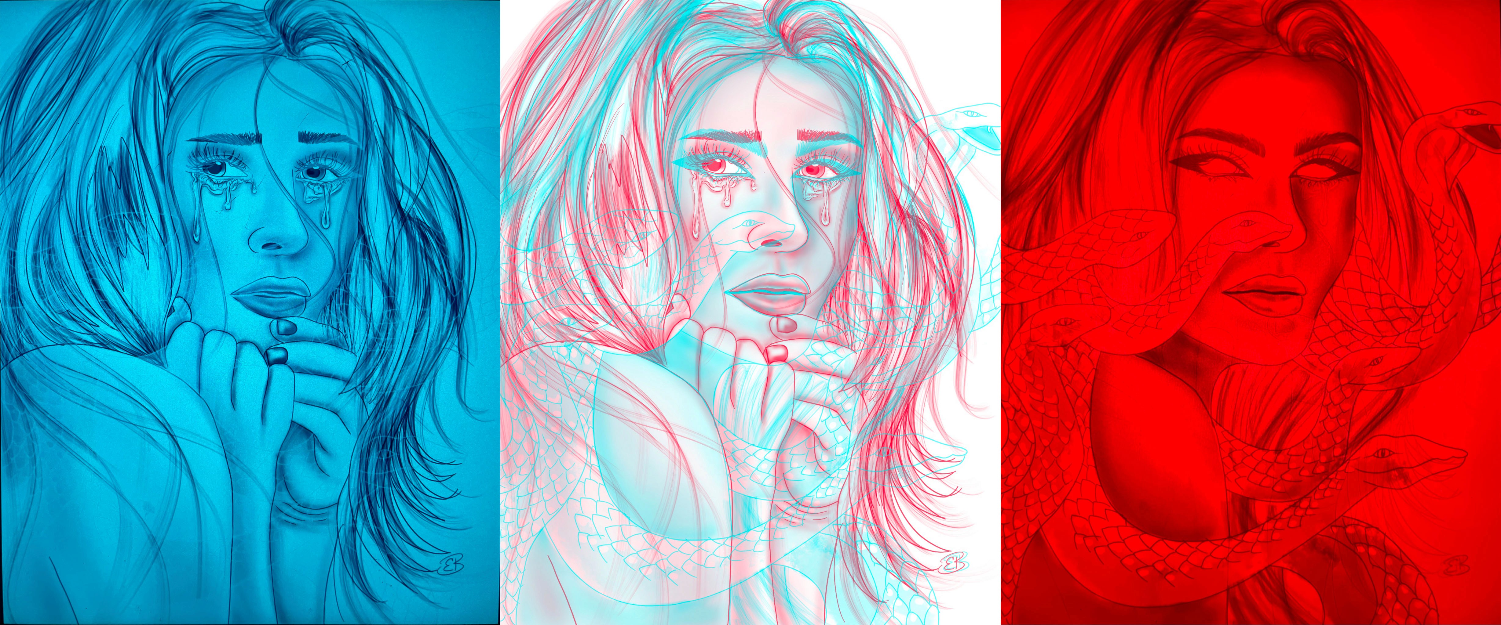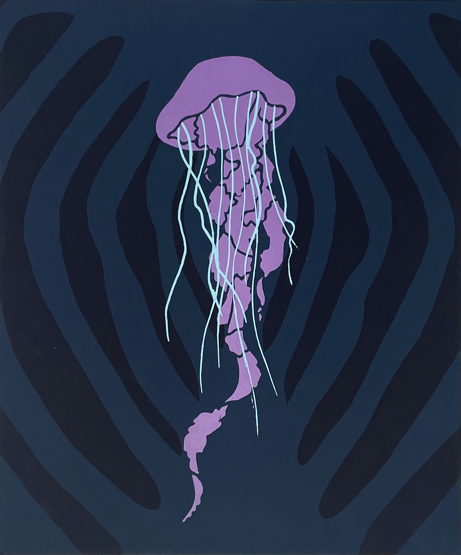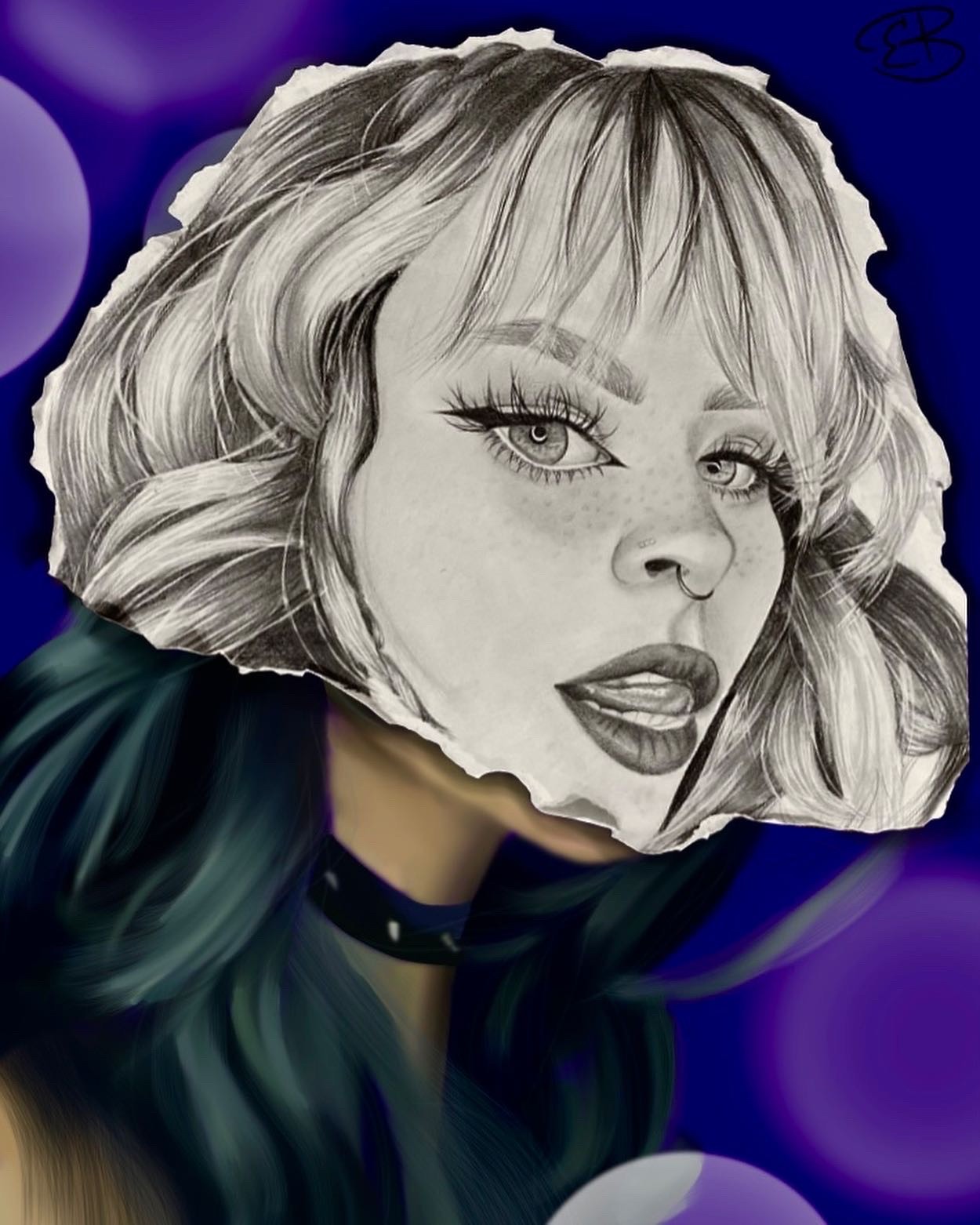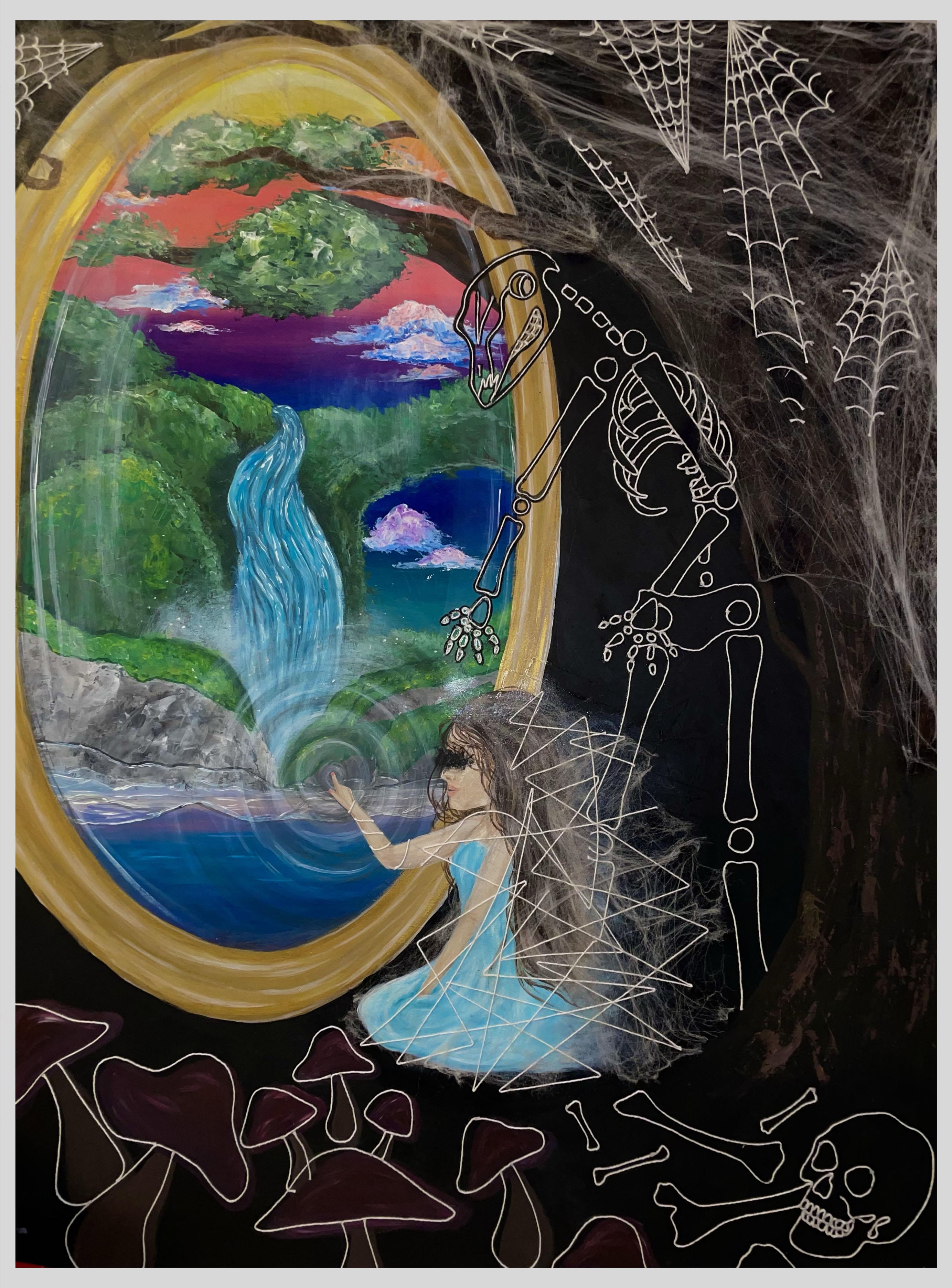 My physical artwork explores texture, depth, and process through mixed media, including acrylic, oil, and watercolor paint, graphite, charcoal, screenprint, and cyanotypes. Working hands-on with physical materials informs my understanding of contrast, layering, and composition in ways that translate directly to digital systems.