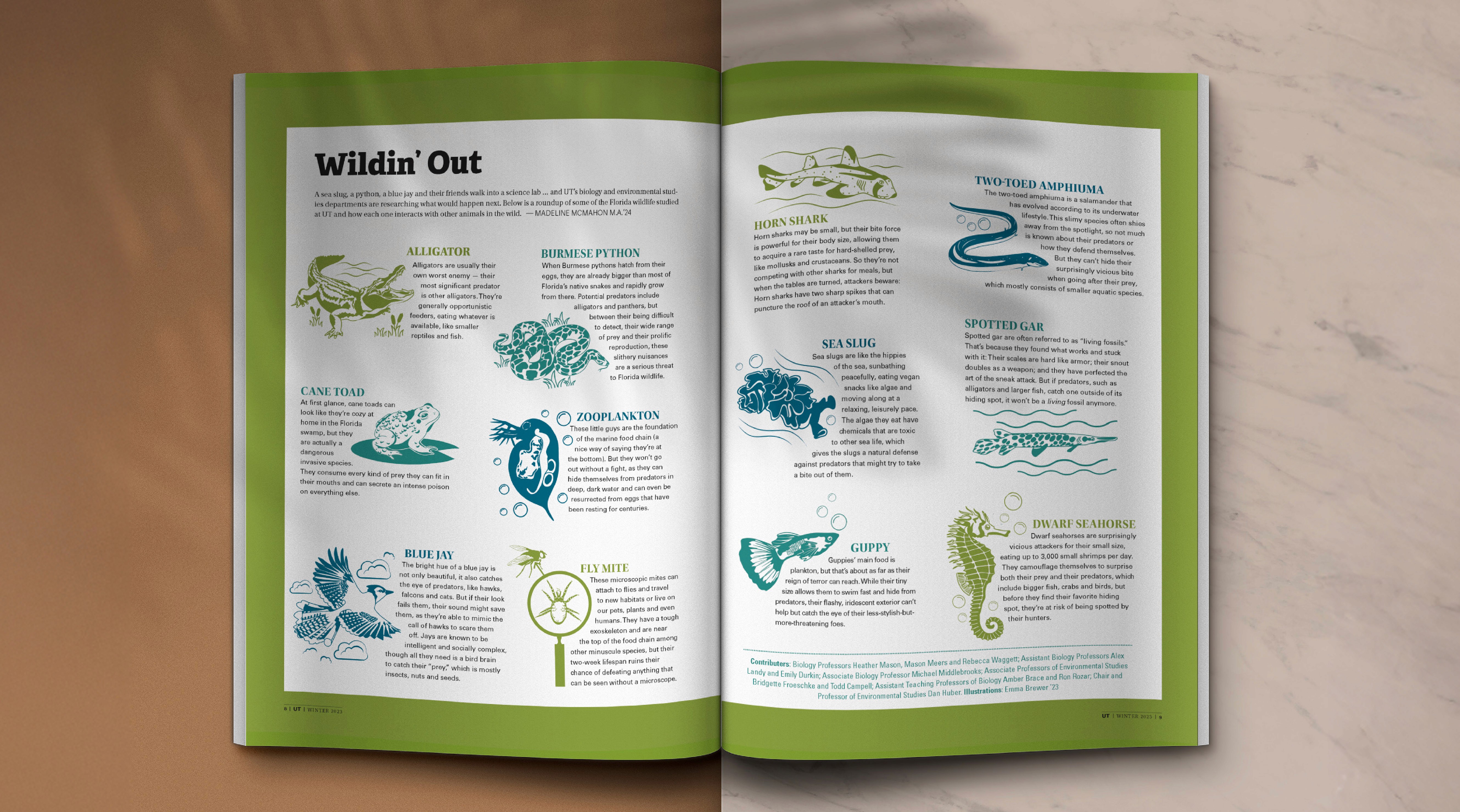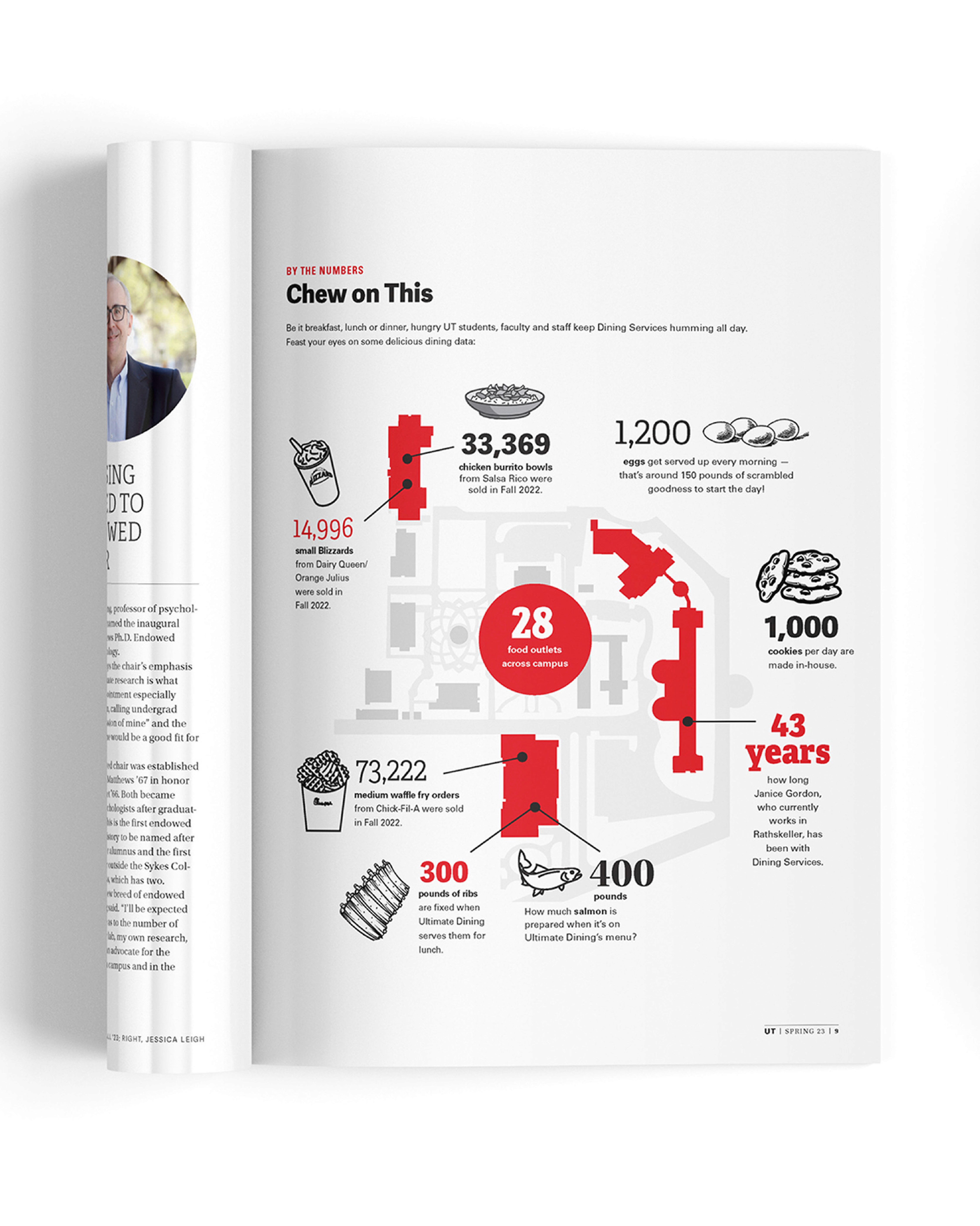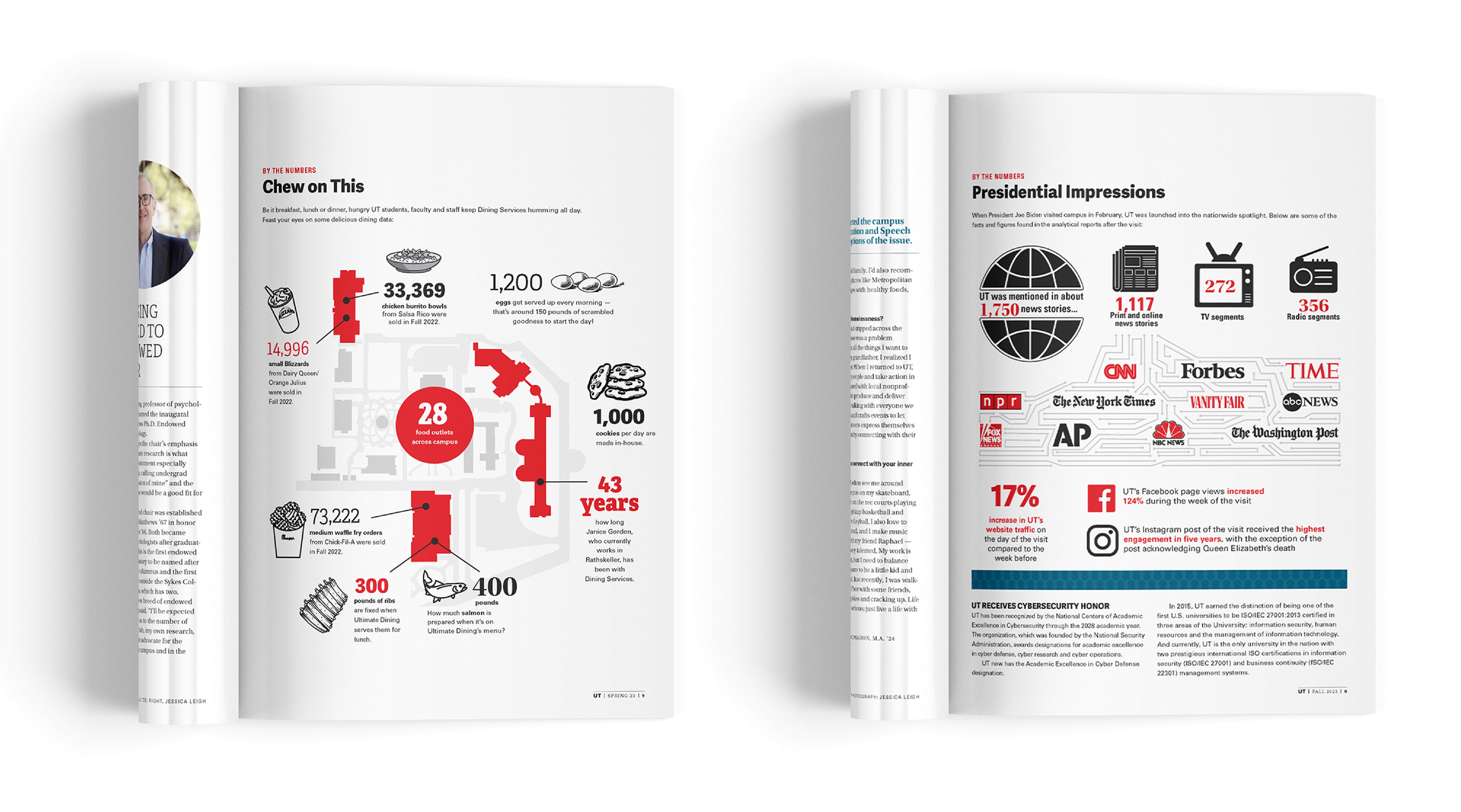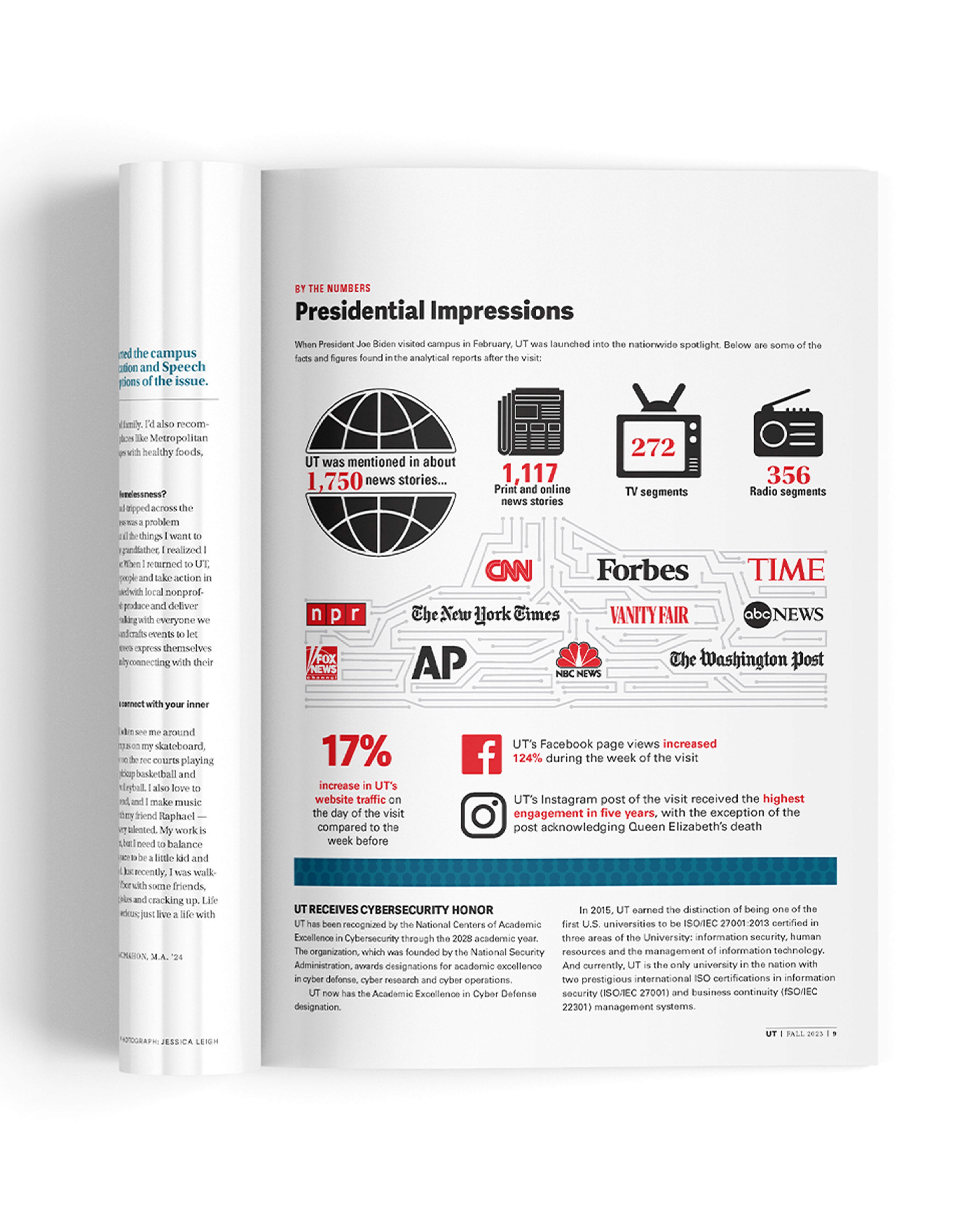 I designed and illustrated infographics published in the UT Journal, translating complex academic and institutional information into clear, engaging visuals. Each spread required close attention to hierarchy, clarity, and print production standards.