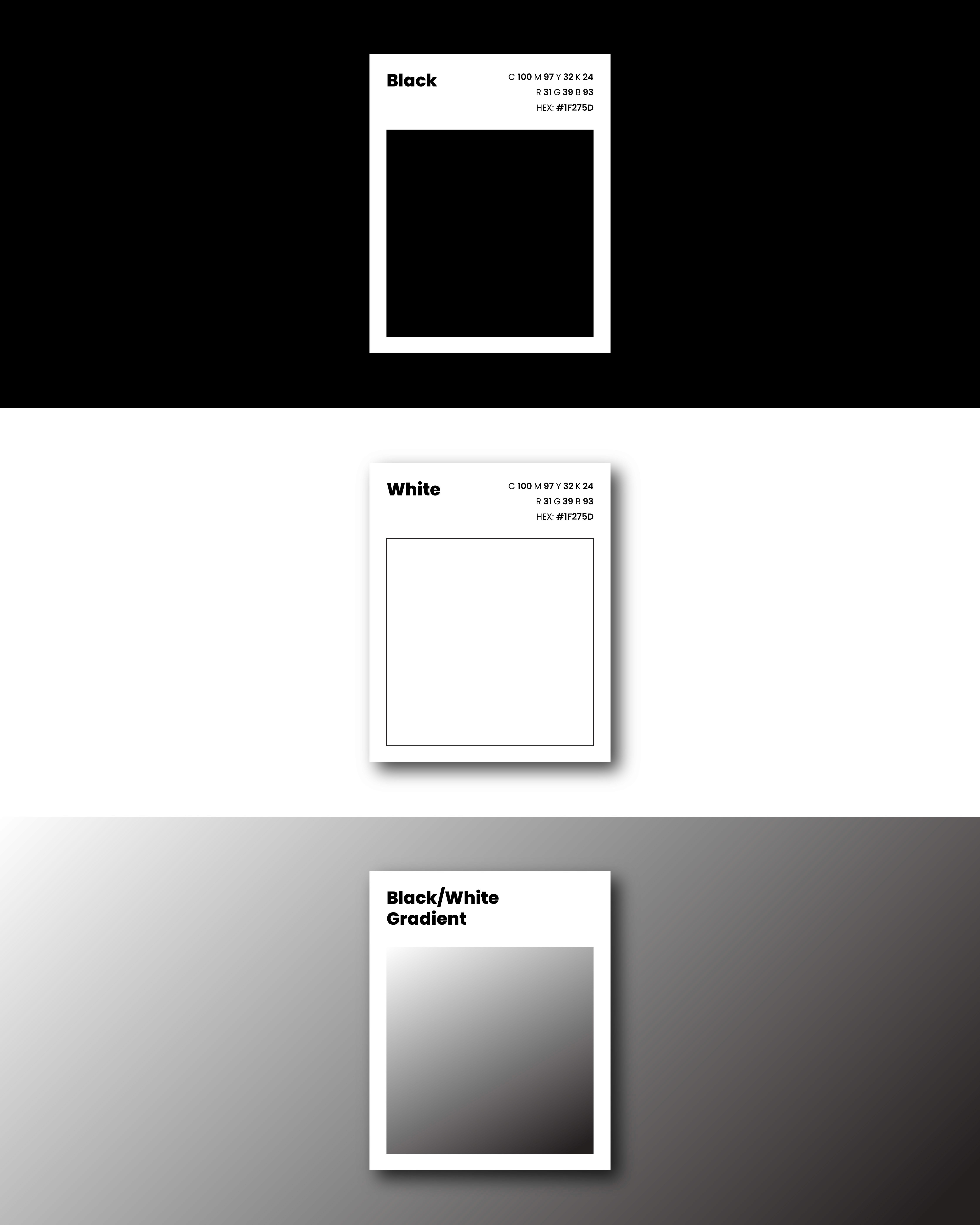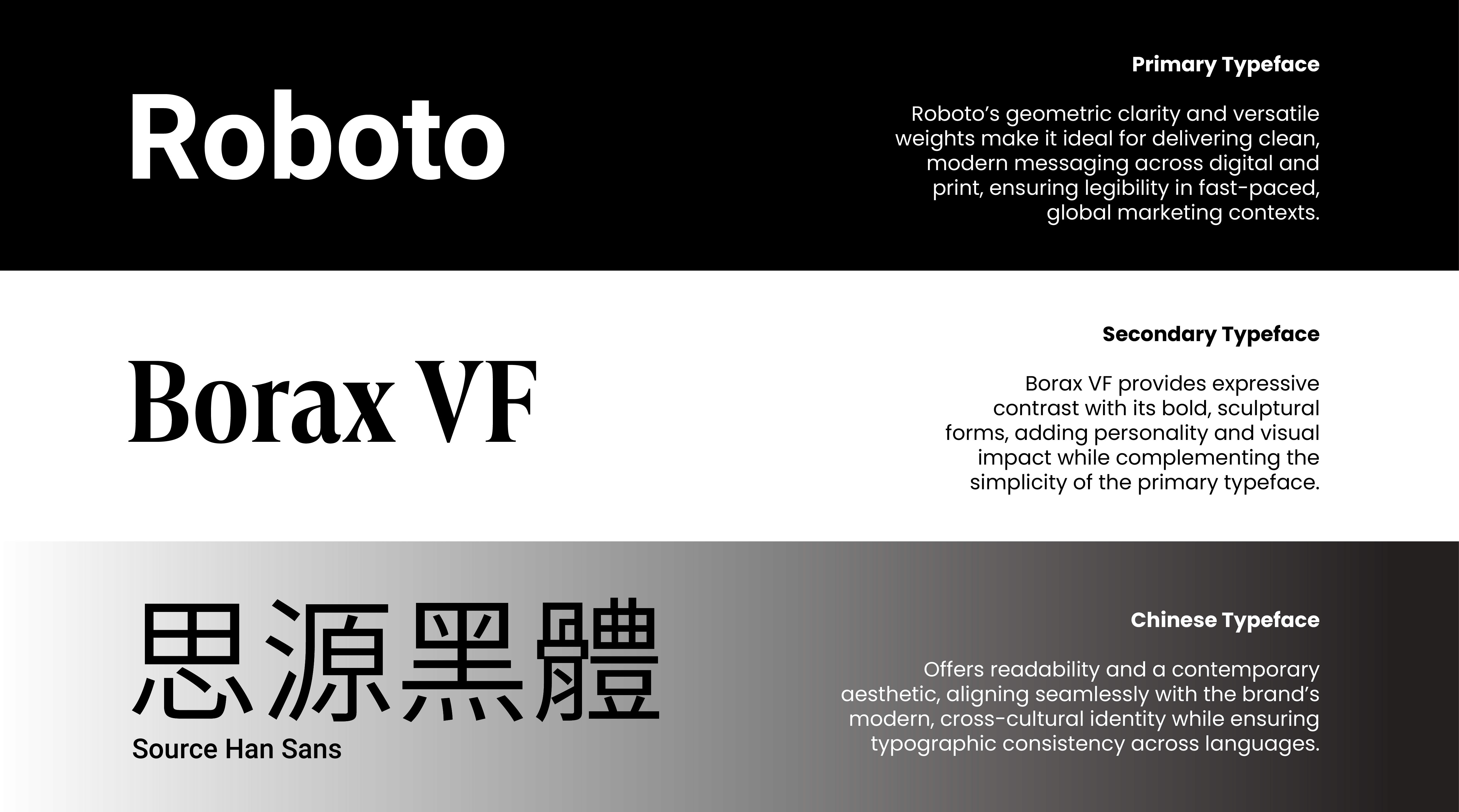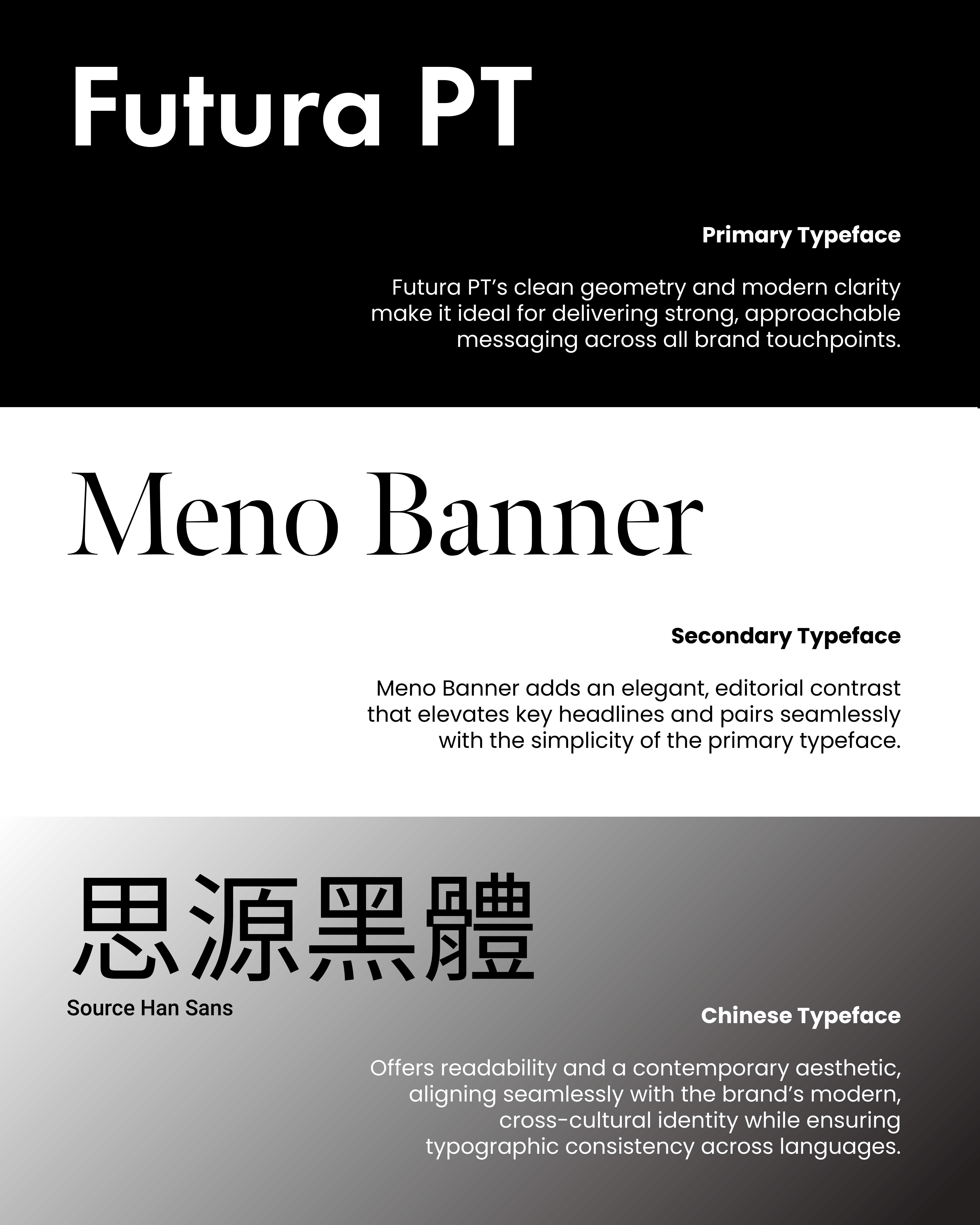 A restrained palette of black, white, and tonal neutrals establishes clarity and confidence while allowing content and messaging to lead. High contrast reinforces legibility across digital and physical environments, supporting both Western and Eastern visual contexts without relying on trend-driven color.