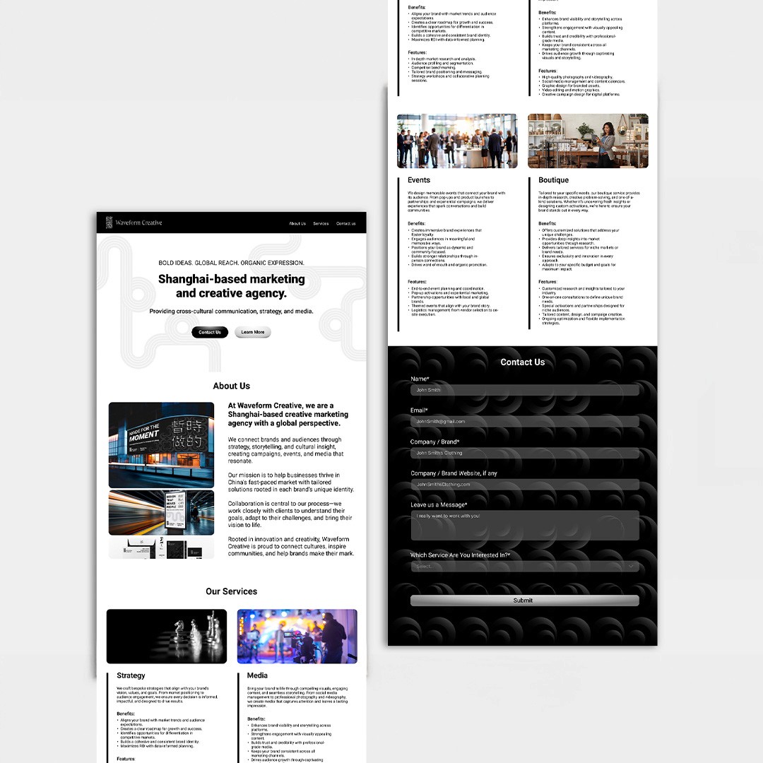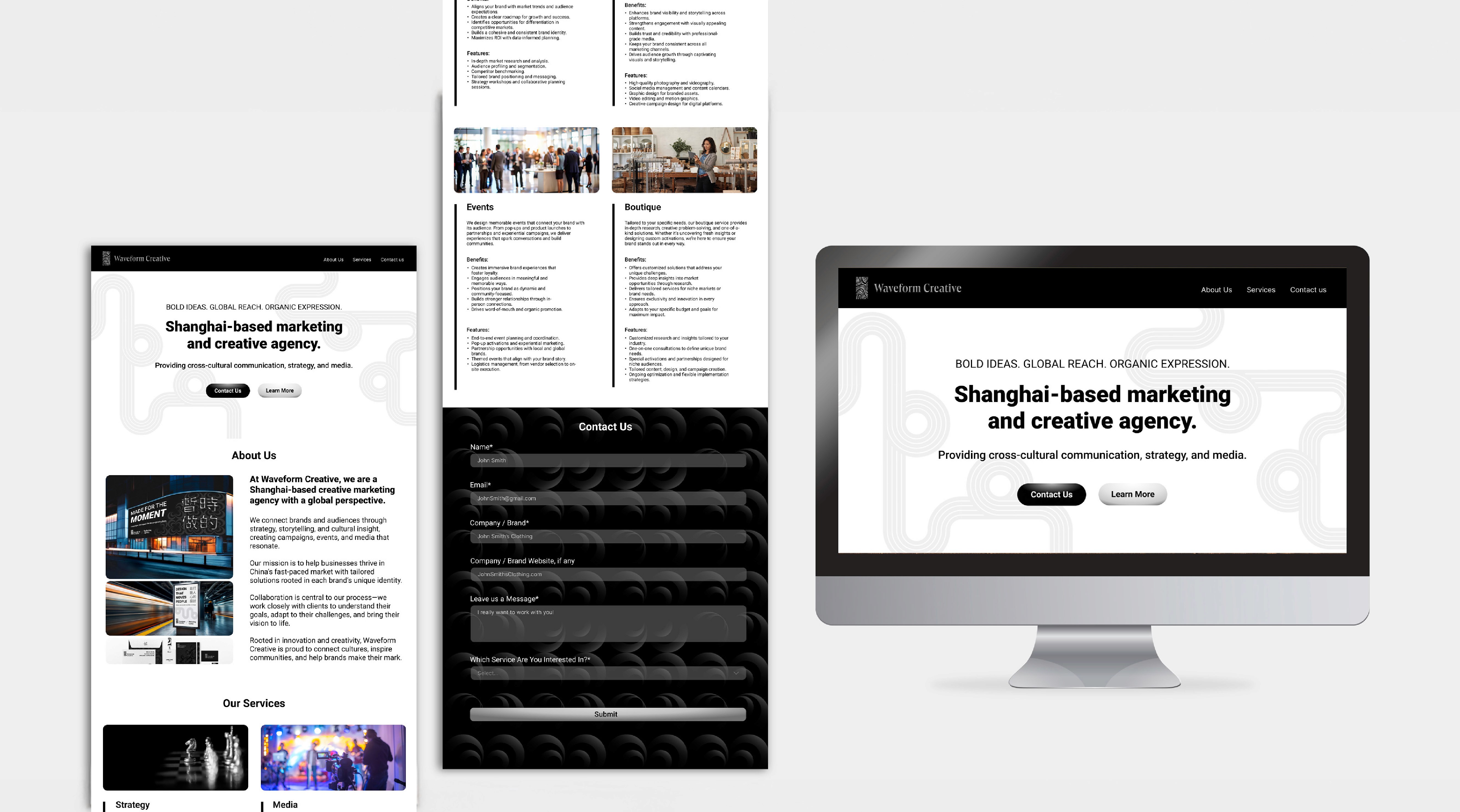 Waveform Creative is an American marketing agency based in Shanghai, specializing in helping brands build loyal, engaged communities across cultural boundaries. This project focused on developing a brand identity and landing page that communicated strategic clarity, cultural intelligence, and collaboration—positioning Waveform as a confident partner for brands navigating global markets.